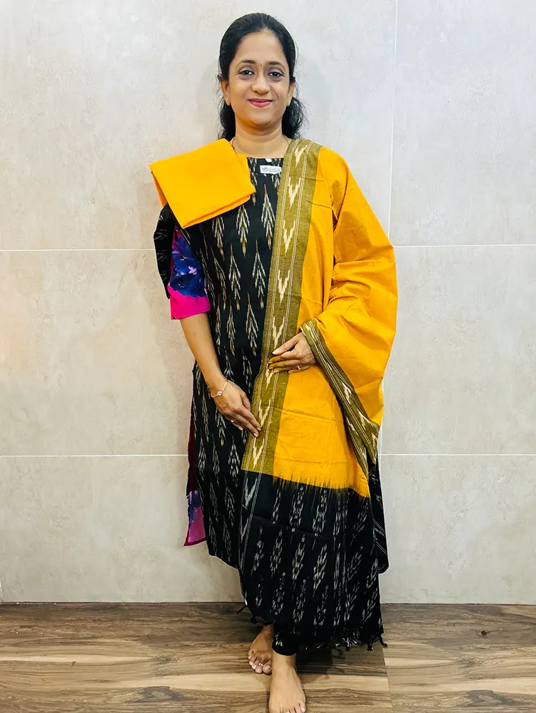 Pure handloom Ikkat cotton top (cotton lining) paired with Ikkat cotton dupatta and cotton bottom (free size)