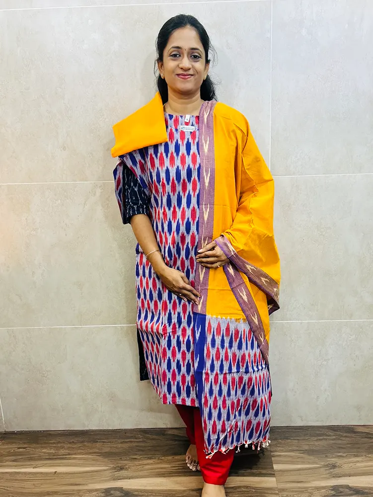 Pure handloom Ikkat cotton top (cotton lining) paired with Ikkat cotton dupatta and cotton bottom (free size)