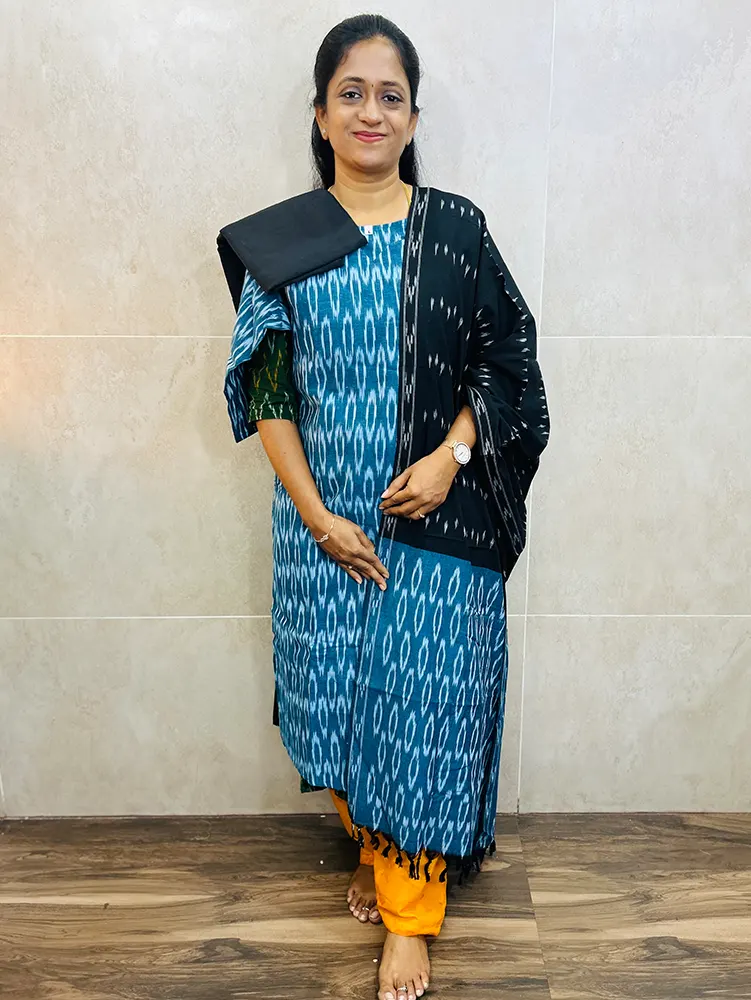 Pure handloom Ikkat cotton top (cotton lining) paired with Ikkat cotton dupatta and cotton bottom (free size)