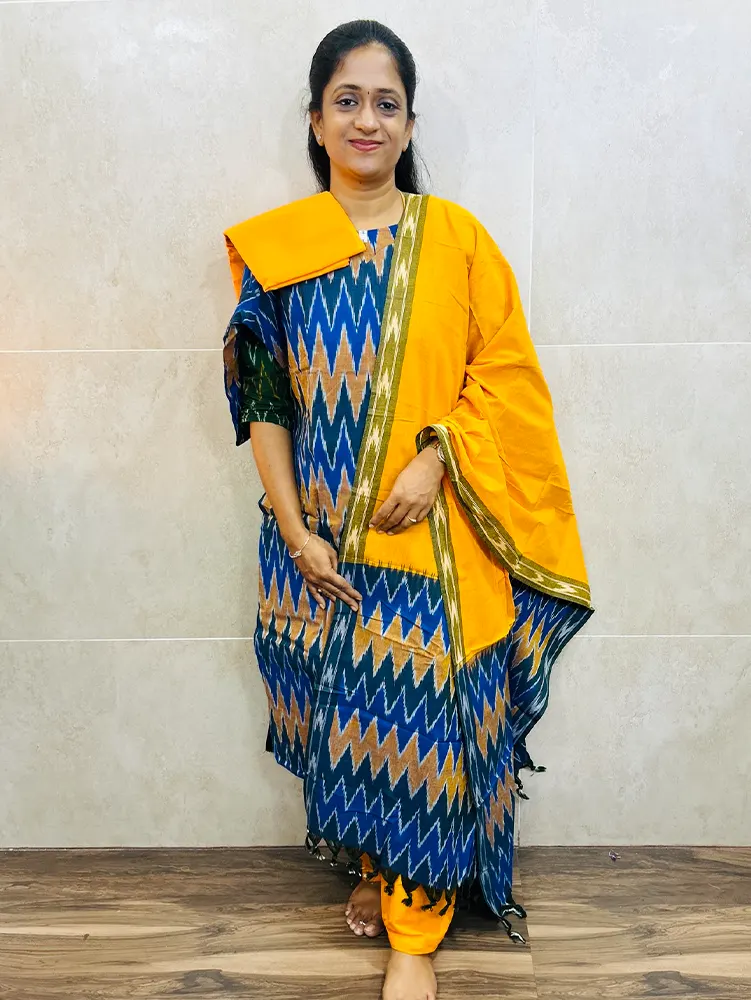 Pure handloom Ikkat cotton top (cotton lining) paired with Ikkat cotton dupatta and cotton bottom (free size)