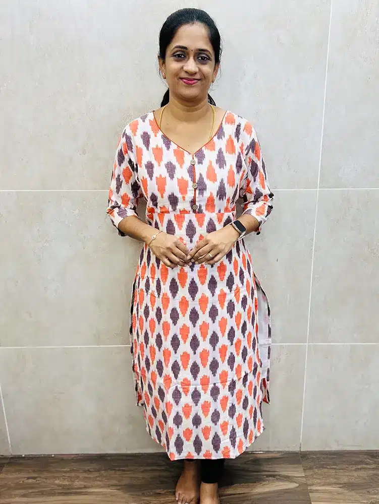 Orange – Pure Ikkat cotton top (cotton lining) with wooden buttons on yoke (Straight cut)