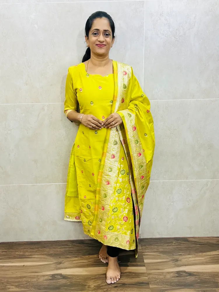 Pure viscose dola silk top(cotton lining)with allover benaras weaving paired with viscose dola silk dupatta