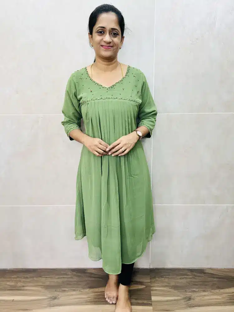 Printed soft Jaipur cotton top (cotton lining) with potli work on yoke paired with printed cotton bottomFaux Georgette top(crepe lining including sleeves)with elegant handwork on yoke and pleated flare(Aline pattern)(straight cut)