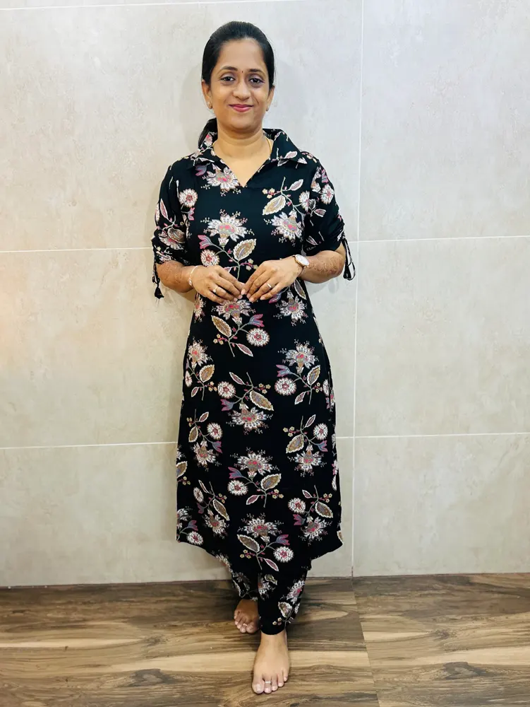 (Black)Printed premium Rayon top(Aline pattern) paired with printed Rayon bottom(semi palazzo)