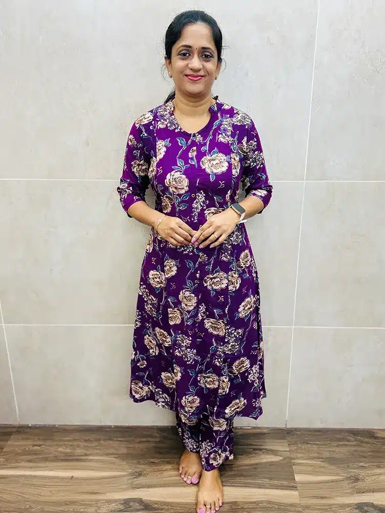 Premium printed Rayon top with allover fancy buttons paired with premium rayon bottom (Princess cut Aline pattern)
