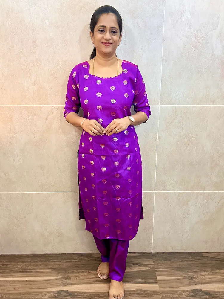Semi Raw silk top (cotton lining) with allover zari weaving buttas paired with semi raw silk bottom (free size)