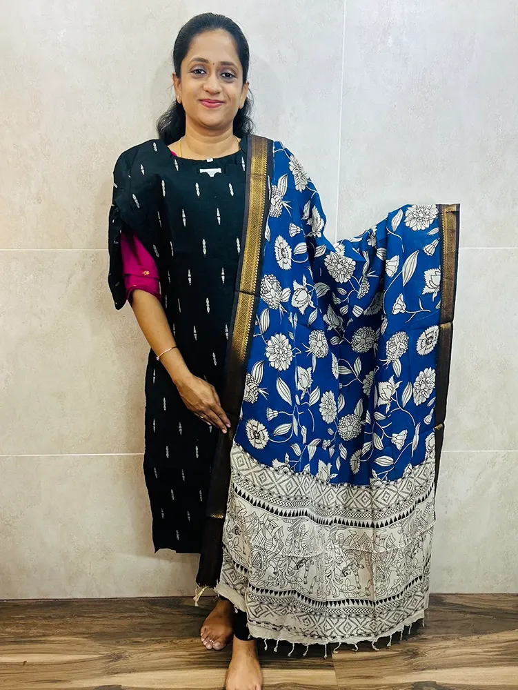 Semi raw silk top (cotton lining) with all over zari woven buttas paired with Kalamkari printed chennuri silk dupatta