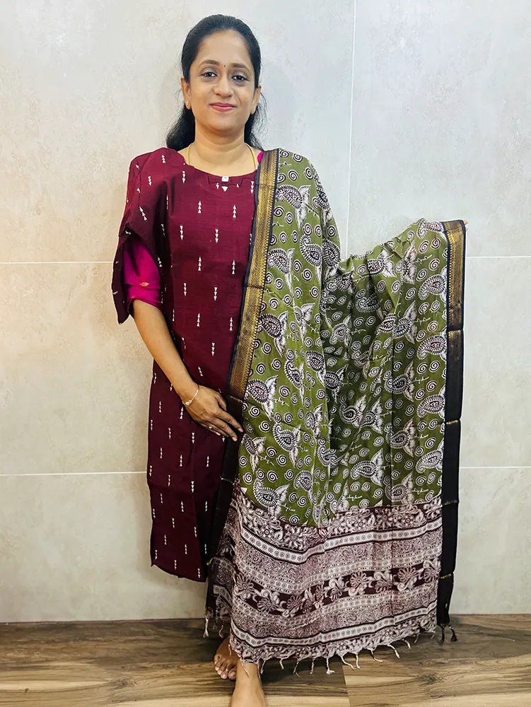 Semi raw silk top (cotton lining) with all over zari woven buttas paired with Kalamkari printed chennuri silk dupatta