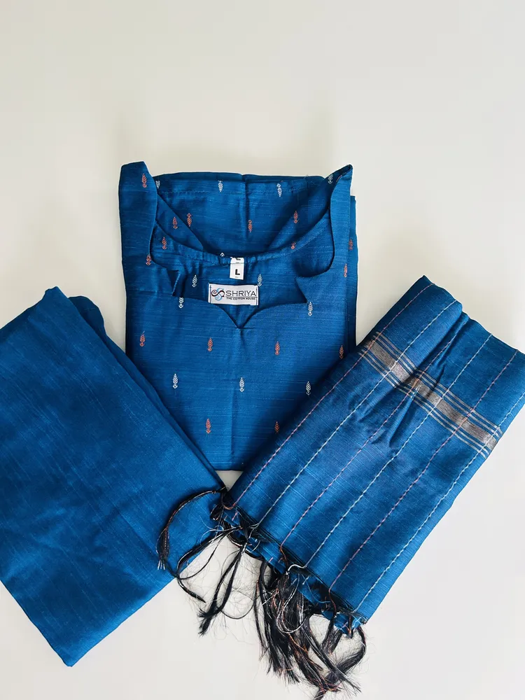 Blue – Semi raw silk top (cotton lining) paired with semi raw silk dupatta and semi raw silk bottom (Free size)