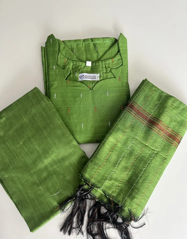 Parrot green – Semi raw silk top (cotton lining) paired with semi raw silk dupatta and semi raw silk bottom (Free size)