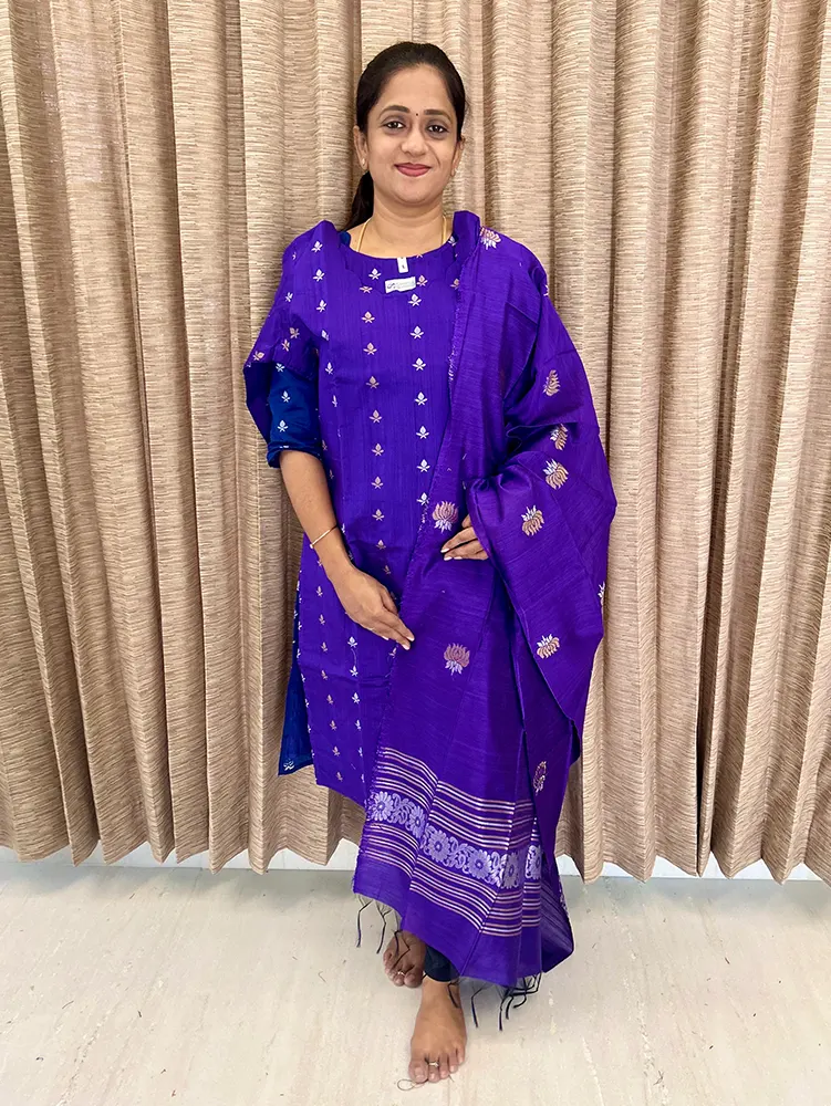 Violet – Semi raw silk top (cotton lining) with all over zari woven buttas paired with zari woven semi raw silk dupatta