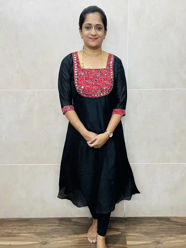 Semi soft silk top with handworked cotton ajrakh patchwork on yoke (Aline pattern)