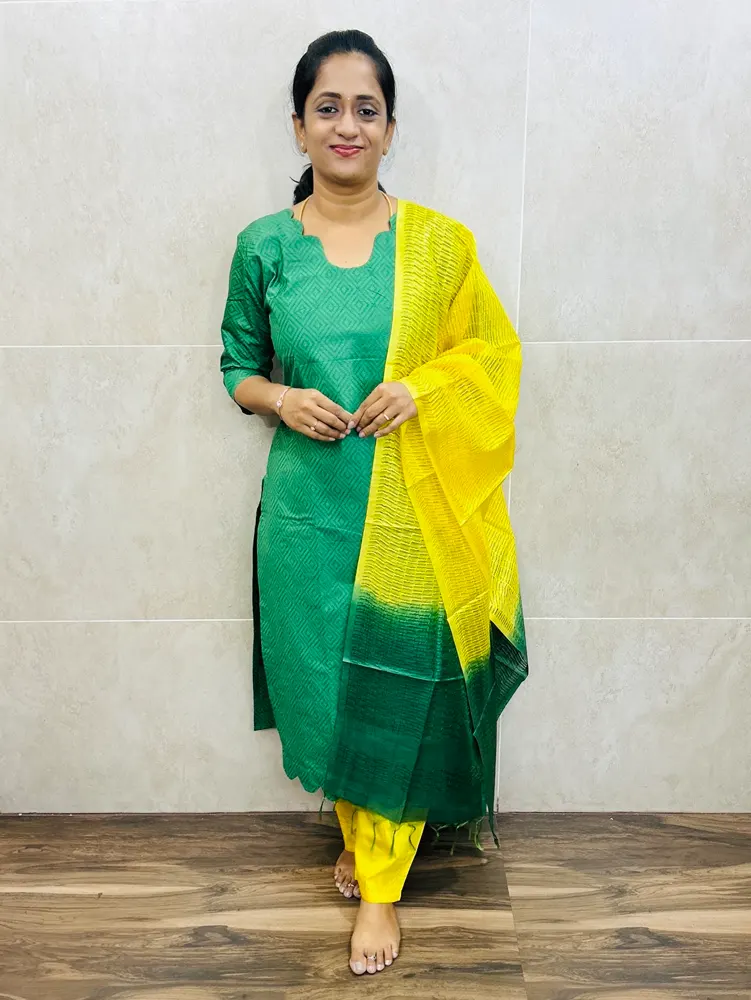 Semi tussar top(cotton lining)with self thread weaving paired with semi tussar dupatta and semi tussar bottom(free size)
