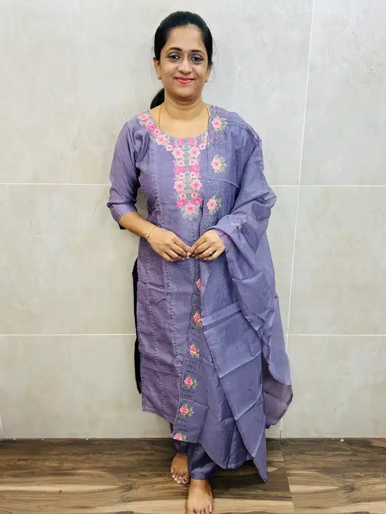 (Greyish purple)Semi tussar top(crepe lining) with allover exclusive embroidered work paired with embroidered soft kota dupatta and silk bottom(straight cut)