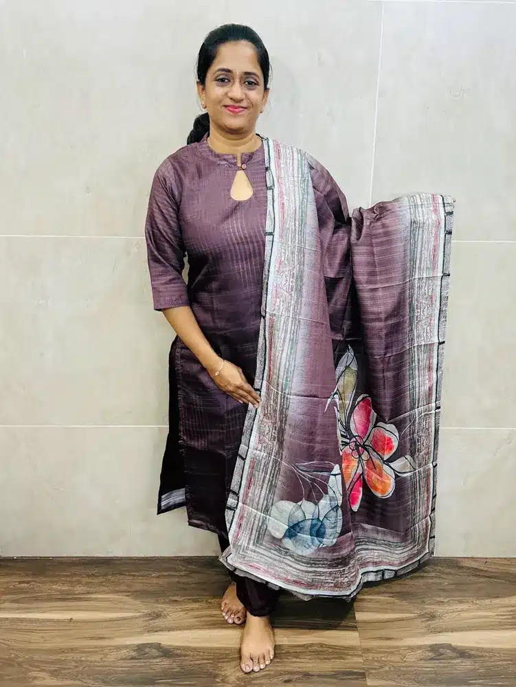 (Dark Brown)Soft Semi tussar top(crepe lining) paired with printed semi tussar dupatta and silk bottom(straight cut)