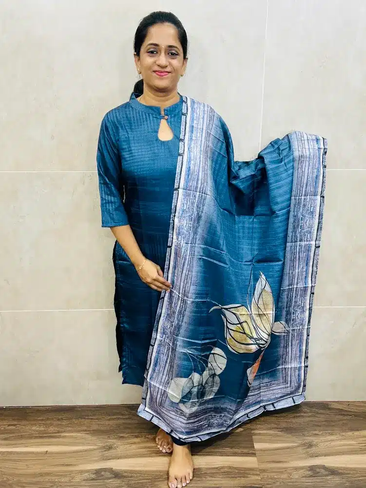 (Dark Greyish blue)Soft Semi tussar top(crepe lining) paired with printed semi tussar dupatta and silk bottom(straight cut)