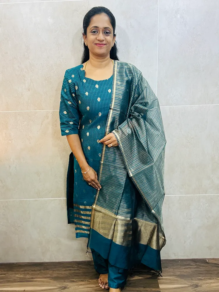 Soft Benaras silk cotton top (cotton lining) with all over zari woven buttas paired with Benaras silk cotton dupatta and semi raw silk bottom (free size)