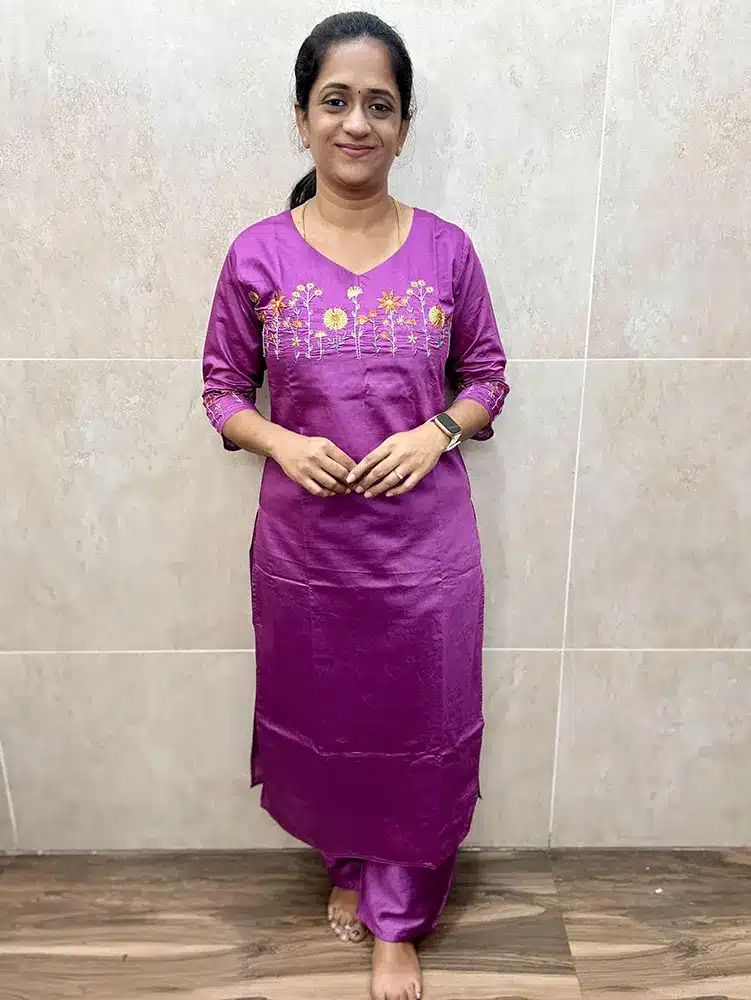 Soft Chanderi silk top (cotton lining) with embroidery work on yoke and sleeves paired with soft Chanderi silk bottom (straight cut)