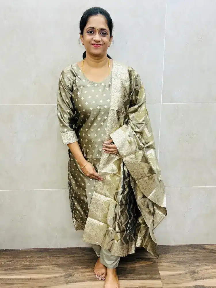 (Grey)Soft Chanderi silk top(full crepe lining) with all over antique zari weaving paired with soft Chanderi silk dupatta and silk bottom(straight cut)