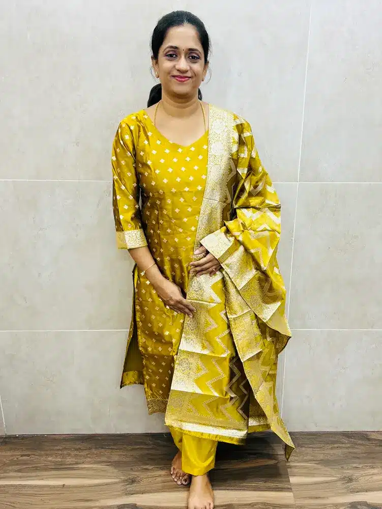 (Golden yellow)Soft Chanderi silk top(full crepe lining) with all over antique zari weaving paired with soft Chanderi silk dupatta and silk bottom(straight cut)