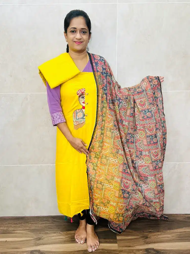 Soft cotton top with fancy embroidered yoke paired with digital printed chiffon dupatta and cotton bottom