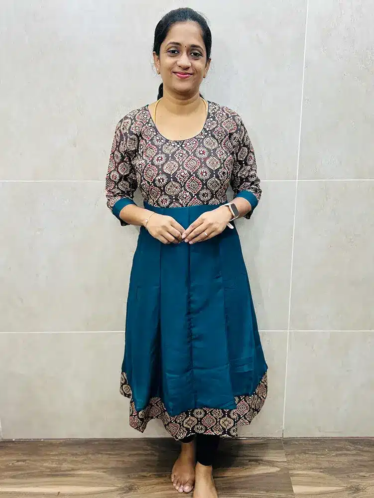 Soft crepe silk top (crepe lining) with handwork’ed Ajrakh yoke and sleeves (Anarkali pattern)