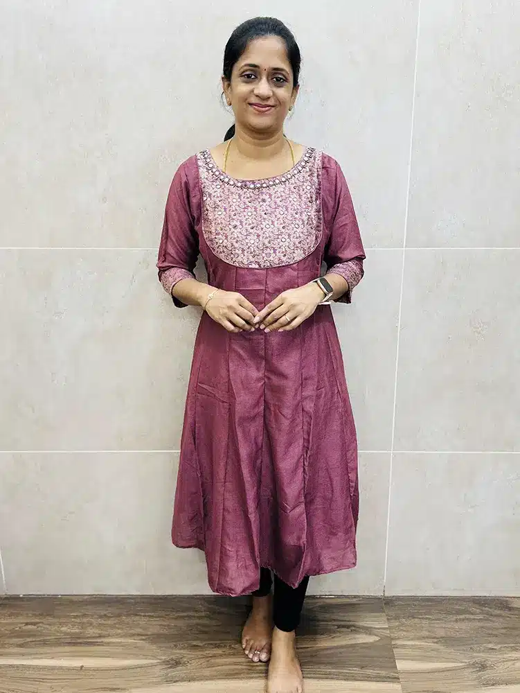 Onion Pink – Soft crepe silk top (crepe lining) with handworked Benaras patchwork on yoke (Anarkali pattern)