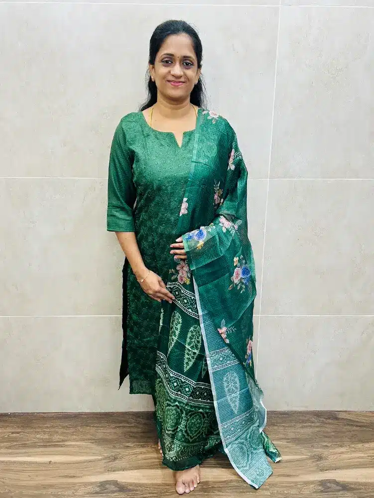 Soft Kota top (full crepe lining) with allover phulkari embroidery paired with printed Kota dupatta and silk bottom (straight cut)