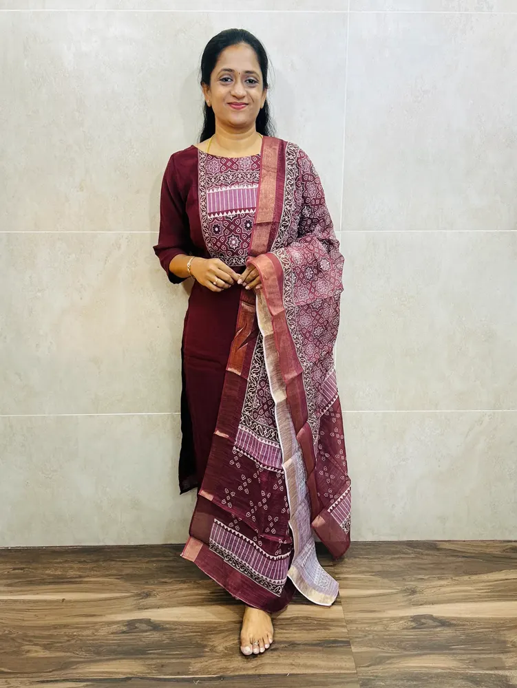 (Maroon)Soft linen cotton top(full crepe lining) with printed patchwork on yoke paired with printed linen cotton dupatta and silk bottom(straight cut)