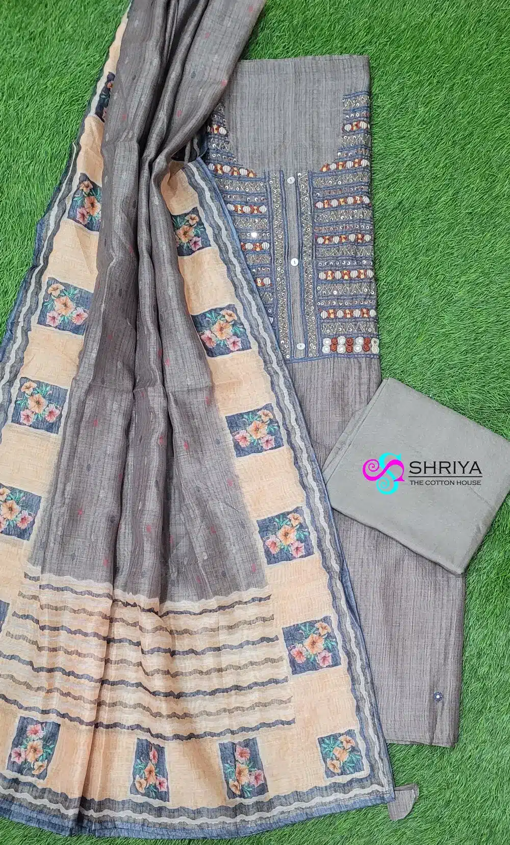 Soft maheshwari silk top with embroidered yoke paired with a printed soft maheshwari silk dupatta and cotton silk bottom