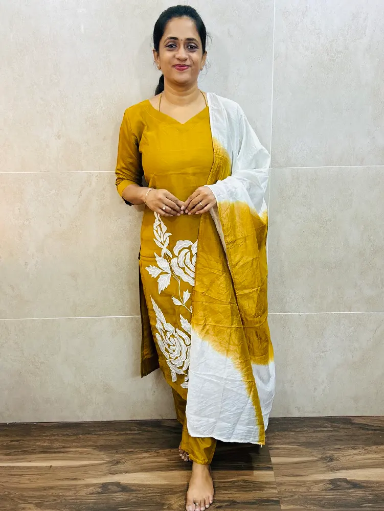 Soft muslin silk top (crepe lining) with exclusive applique work paired with muslin silk dupatta and silk bottom (straight cut)