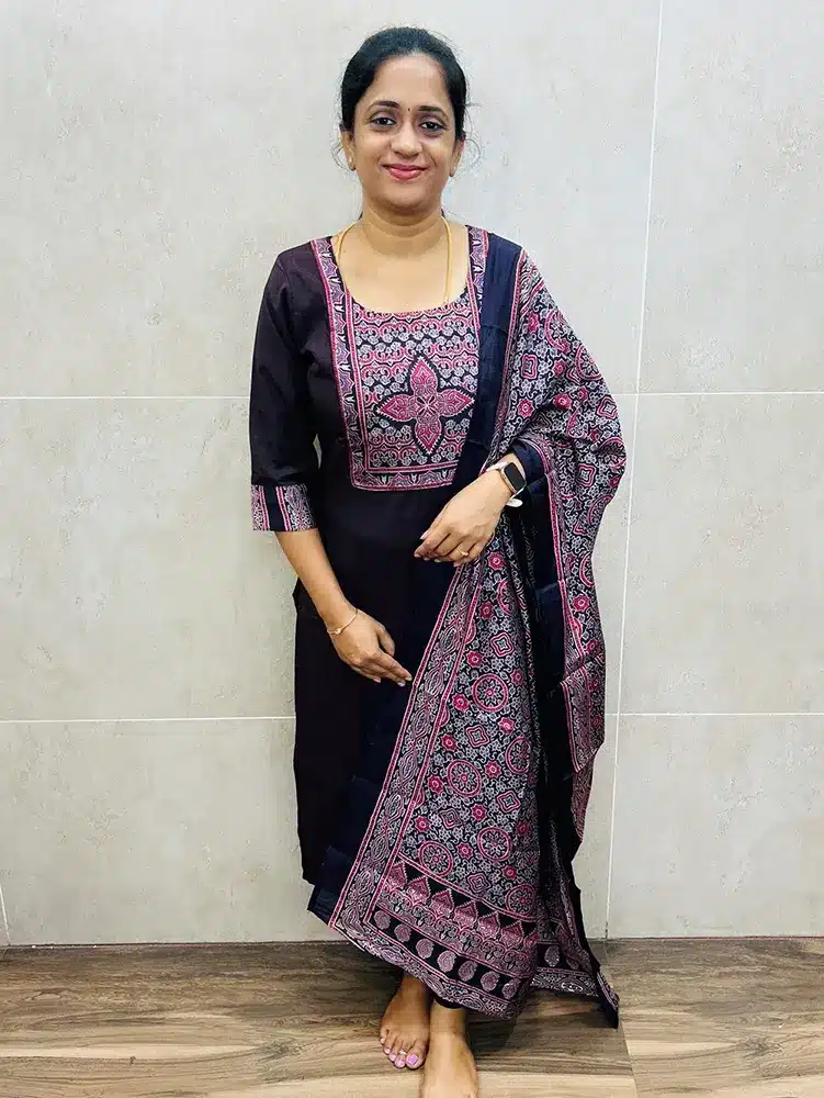 Maroon – Soft muslin silk top (crepe lining) with Ajrakh patchwork on yoke paired with printed muslin silk dupatta