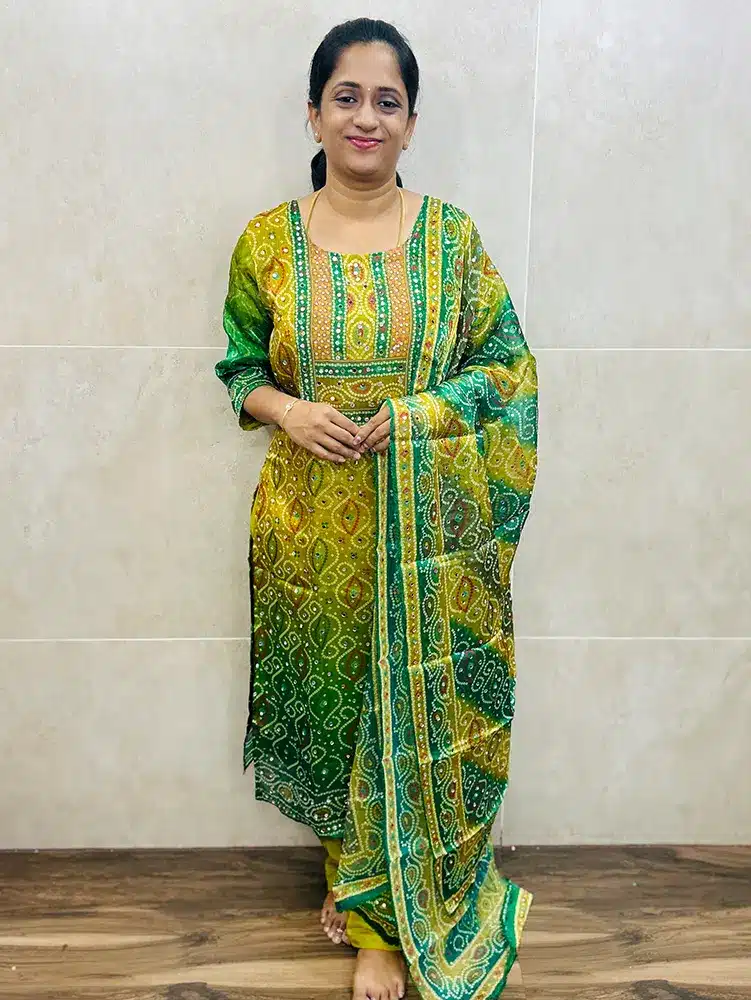 Soft organza top (full crepe lining) with allover mirror work paired with mirror worked soft organza dupatta and soft silk bottom (free size)