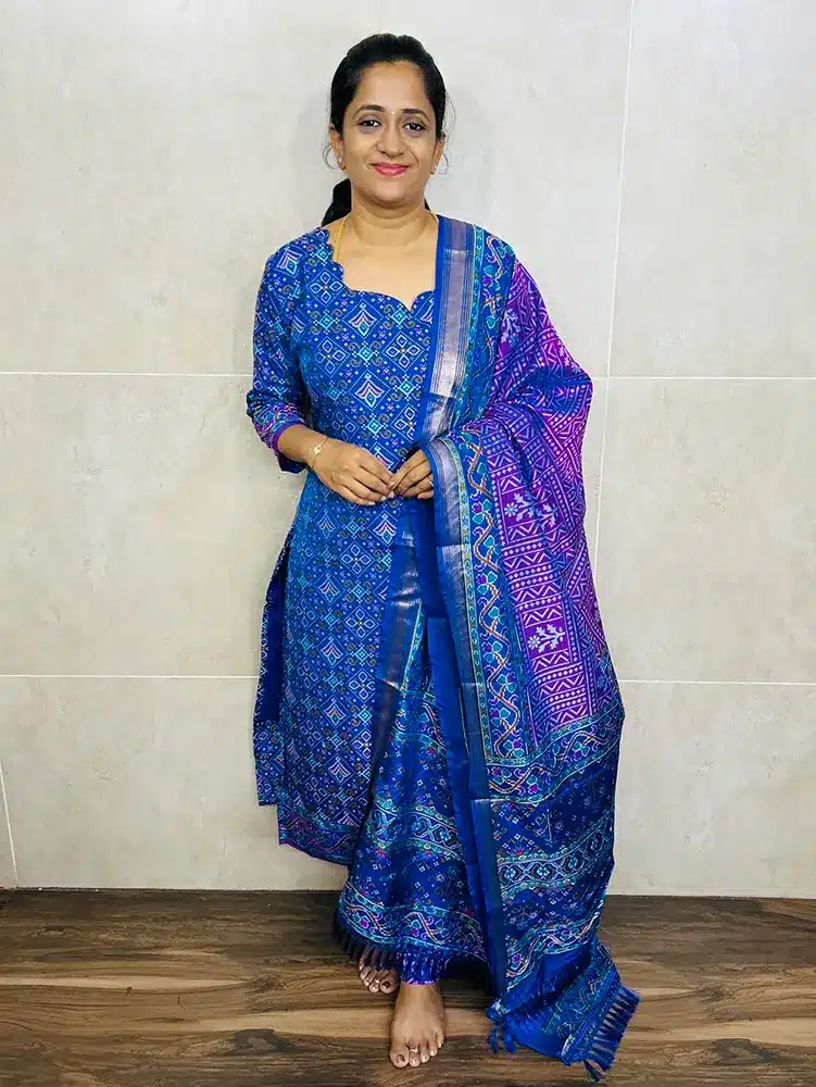 Pattern 2 – (Royal Blue) Soft Patola silk top(cotton lining)paired with Patola silk dupatta and printed silk bottom(free size)