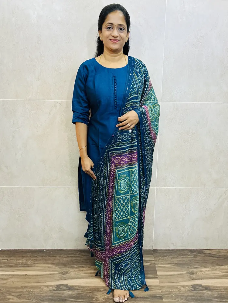 Soft silk top (cotton lining) with Potli work on yoke paired with mirror worked bhandini Dupatta and silk bottom (free size)