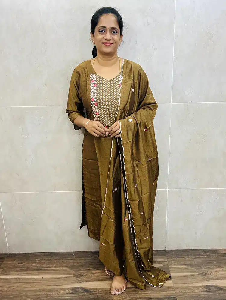Brown – Soft silk top(crepe lining) with exclusive embroidery on yoke and dupatta paired with soft silk bottom (straight cut)