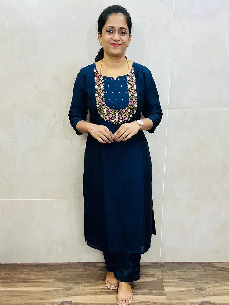 Soft silk top (crepe lining) with embroidered yoke paired with silk bottom (straight cut)