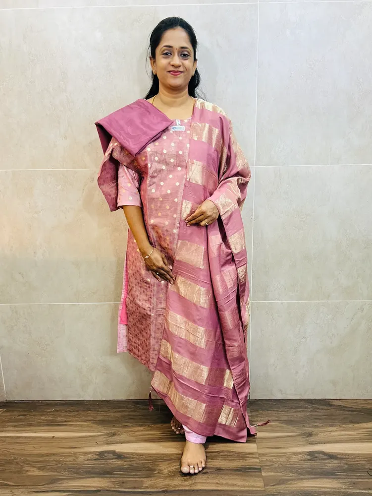 Soft tissue silk top(cotton lining) with allover jacquard and zari woven buttas paired with soft silk dupatta and silk bottom(free size) (Copy)