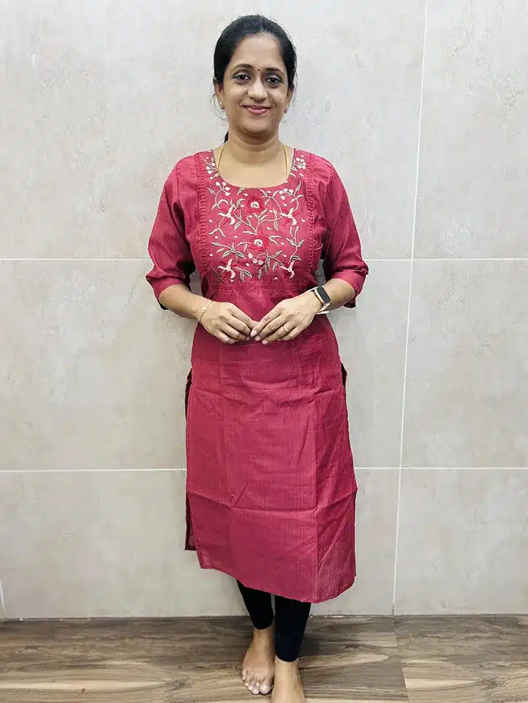 Onion Pink – Textured soft silk top (crepe lining) with machine embroidered yoke (straight cut)