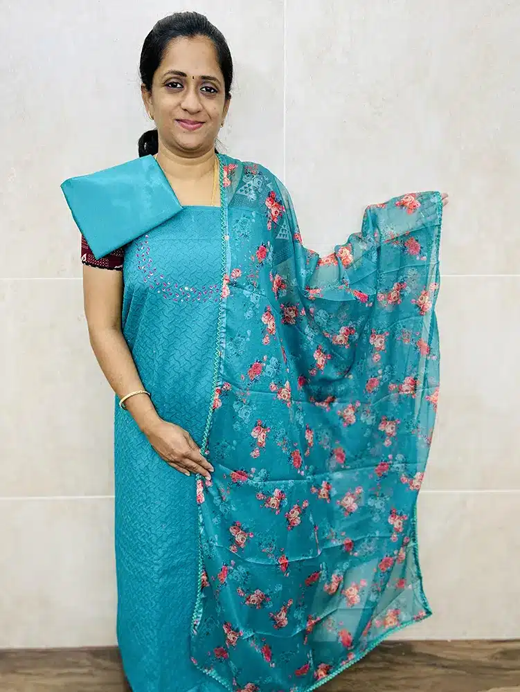 Most of our cotton salwar suits, measurement of the top will be 2.5 meters, dupatta will be from 2.2 to 2.5 meters and bottom will be 2 meters. If you have measurement constraint, please check with us through whatsapp (9176641794) prior booking.