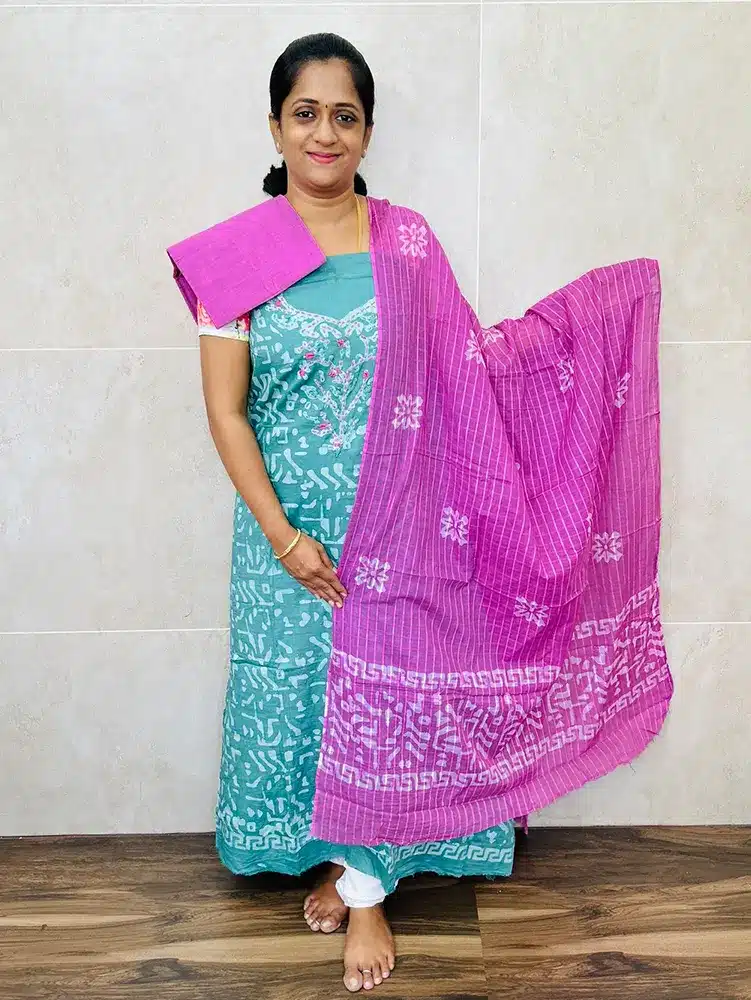Batik printed cotton top with embroidered yoke paired with cotton dupatta and cotton bottom