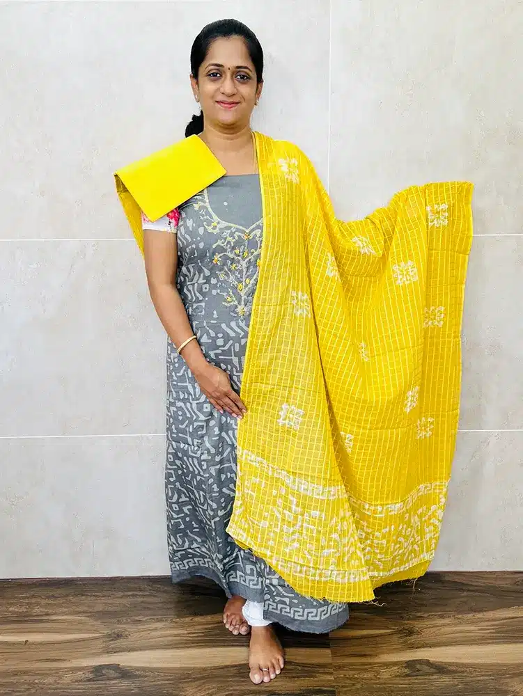 Batik printed cotton top with embroidered yoke paired with cotton dupatta and cotton bottom