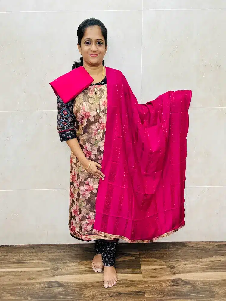 Digital printed Chanderi silk top (lining included) paired with embroidered chiffon dupatta and silk bottom
