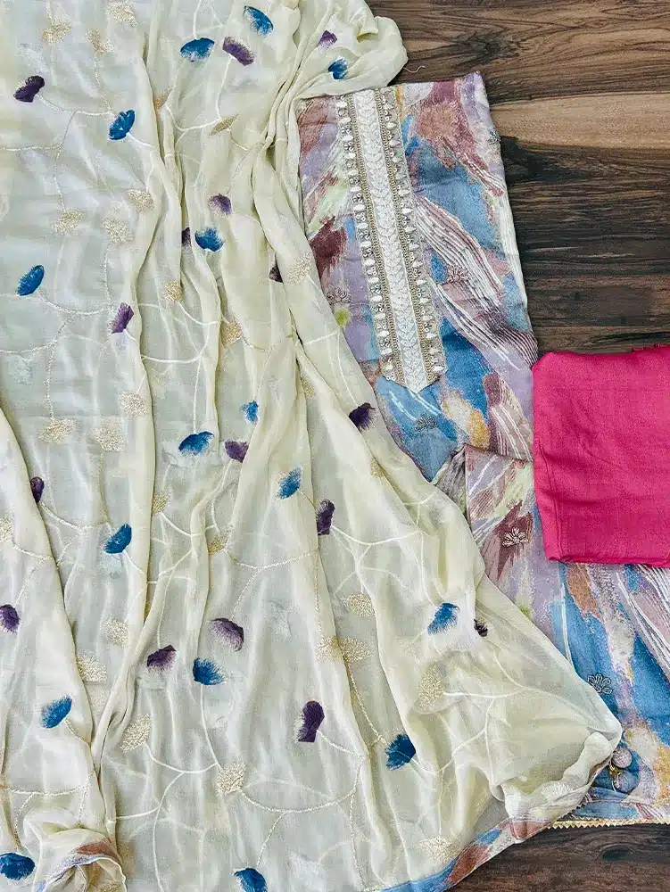 Digital printed muslin silk top paired with a embroidered Georgette dupatta and muslin silk bottom