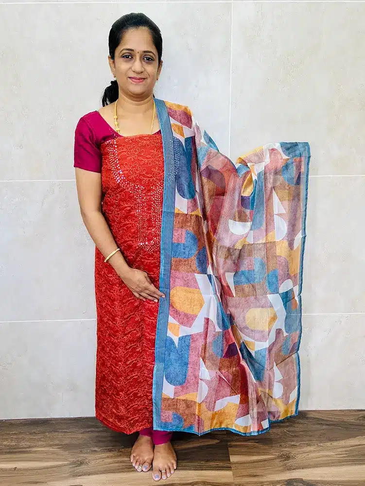 Most of our cotton salwar suits, measurement of the top will be 2.5 meters, dupatta will be from 2.2 to 2.5 meters and bottom will be 2 meters. If you have measurement constraint, please check with us through whatsapp (9176641794) prior booking.