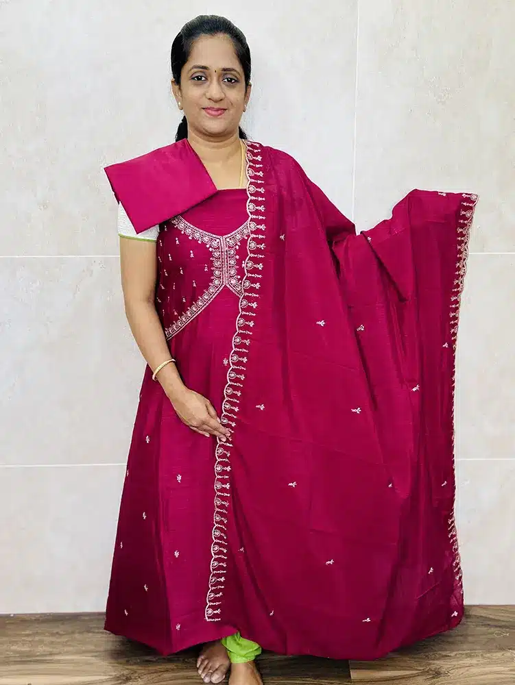 Embroidered soft silk top (alia cut patterned yoke) paired with soft silk dupatta and silk bottom