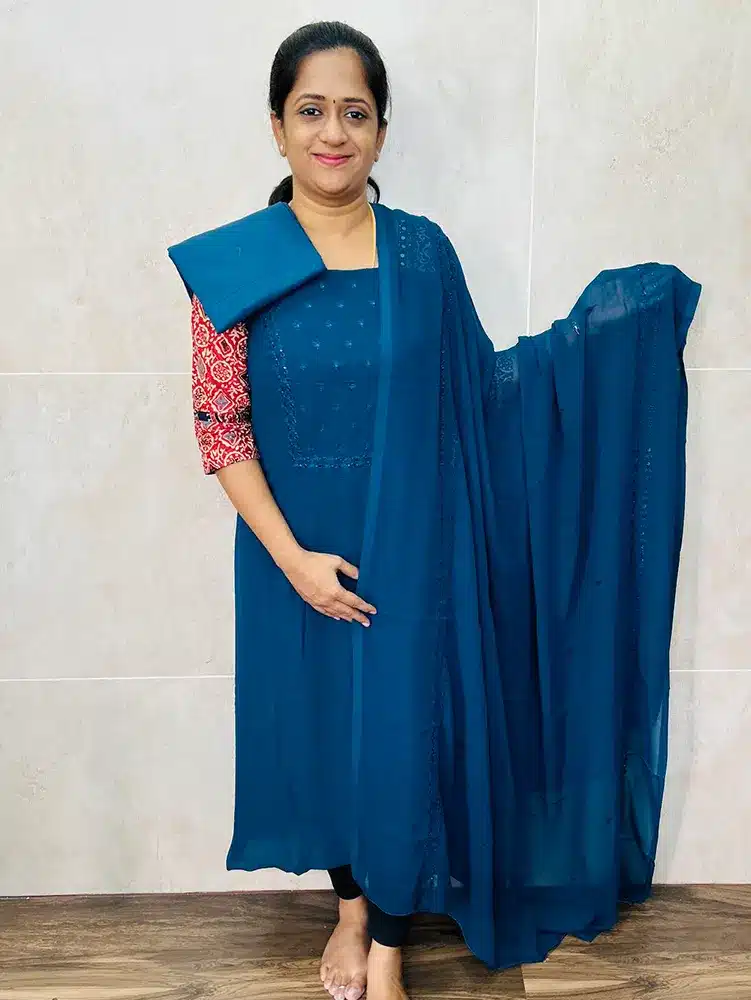 Most of our cotton salwar suits, measurement of the top will be 2.5 meters, dupatta will be from 2.2 to 2.5 meters and bottom will be 2 meters. If you have measurement constraint, please check with us through whatsapp (9176641794) prior booking.