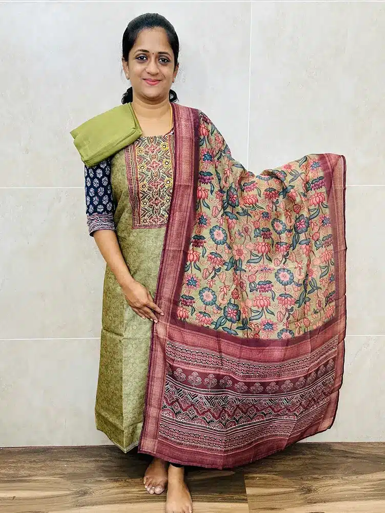 Maheshwari silk top with embroidered yoke paired with Maheshwari silk dupatta and cotton silk bottom