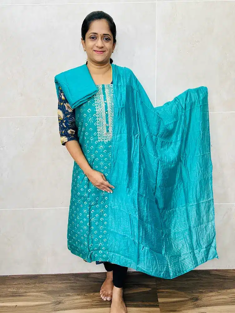 Most of our cotton salwar suits, measurement of the top will be 2.5 meters, dupatta will be from 2.2 to 2.5 meters and bottom will be 2 meters. If you have measurement constraint, please check with us through whatsapp (9176641794) prior booking.