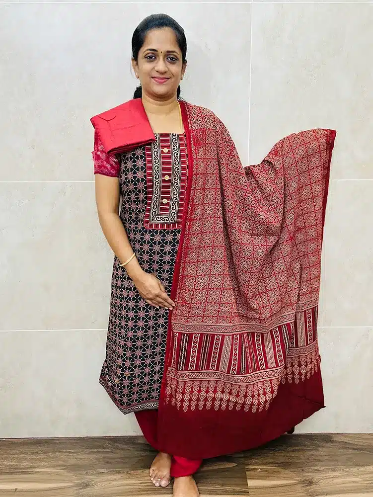 Natural dyed Ajrakh cotton top with Ajrakh dupatta and cotton bottom